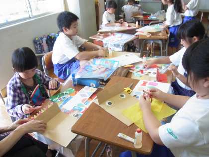 図画工作科の学習では、紙袋を使った工作をしています。袋の形を活かしてぱくぱく口が動く「ぱくぱっくん」を作り始めました。子供たちは、目や歯の位置やかざり等自分だけの「ぱくぱっくん」になるように工夫をしています。完成が楽しみです。