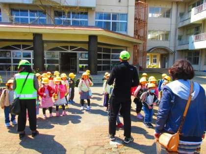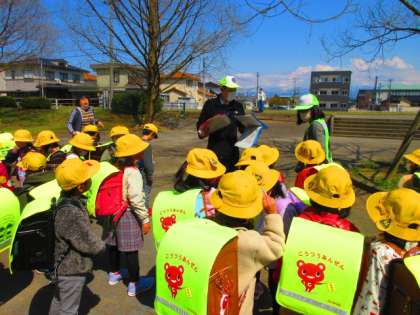 自分の足で登下校し始める1年生は、交通安全の具体的な指導を行うため、教員と一緒に下校しながら、歩き方、横断歩道の渡り方などを指導します。