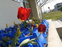 きょうは、きょねんみなさんがうえた「チューリップ」です。赤やむらさき、き色などのきれいなチューリップがさいていましたね。このしゃしんはそのひとつです。ざんねんなことに、ほかのチューリップはかれてしまい、これがさいごのチューリップでした。