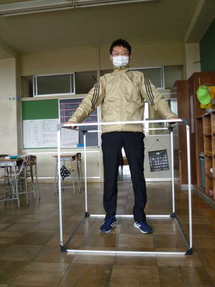 先生が、たて1m、横1m、高さ1mの立方体の中に入っておられます。