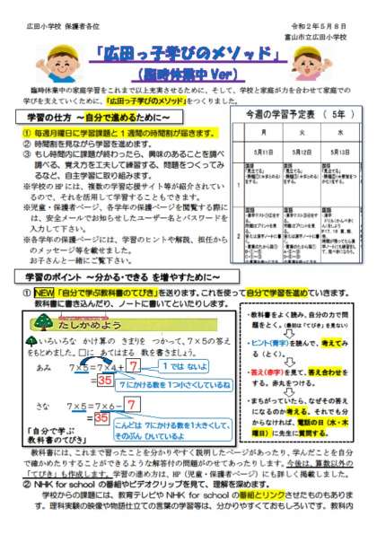 広田小学校では、臨時休業中の「家庭での自主学習」をより充実させるため、新たに「広田っ子学びのメソッド」を開始します。