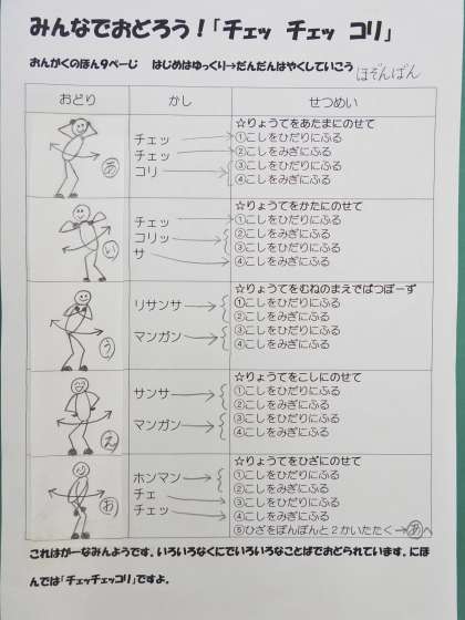 5がつ12にちのおんがくは、「ちぇっちぇっこり」です。「ちぇっちぇっこり」は、にほんからとおくはなれた「があな」のくにのあそびうたです。ききなれないうたなのは、「があな」のくにのことばでうたわれているからなんですね。でも、うたっていて、とってもたのしくなるうたですよ!おとうさんや、おかあさんもしっているかもしれないので、きいてみてね。