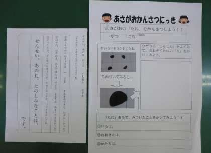 「あさがおのたねかんさつかあど」と「せんせい、あのね」の2まいは、せんせいに ふうとうで だすことになっています。(くわしいことは、おうちのひとにきいてね)みんなのがんばりを、せんせいたちは たのしみにまっています。