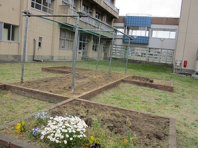 用務員の酒井さん(別の学校の用務員さんもおうえんにきてくださいました)がヘチマの観察をしやすいように、ちゅう車場側にあったヘチマの畑を後館と北中館の間の花だんに移動してくださいました。畑にはスプリンクラーという水やりをしてくれる機械がついているので、休みの間もヘチマたちにしっかり水をやることができます。また、教室前のろう下からも畑をのぞけるので、学校に来た時にたくさん観察しましょうね。