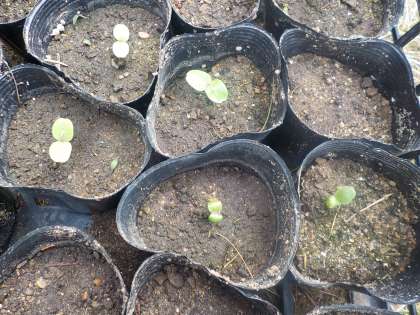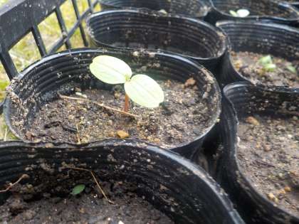 みなさんのホウセンカはぐんぐん育ってきています。半分ほどのポットから芽が出てきています。きのうよりも大きくなった芽もあります。東げんかんの横にあるので、登校日に見ましょうね。