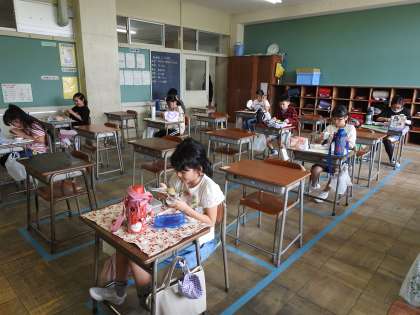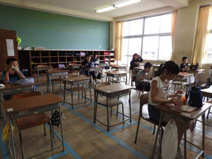 簡易なお弁当でもうれしいようです。食べることに集中してるので、教室はとても静かです。