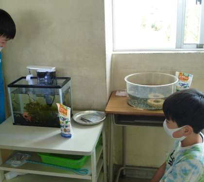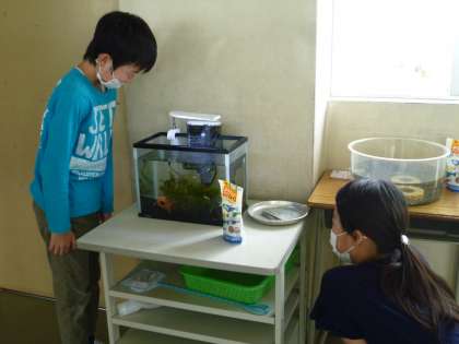 子供たちの登校に合わせて、メダカがやってきました。子供たちは、気持ちよく泳ぐメダカに、朝、つなぎの時間などに水槽に集まるのですが、一人が水槽に近寄ると他の子供たちは離れるなど、互いの距離を意識して過ごす様子が見られました。