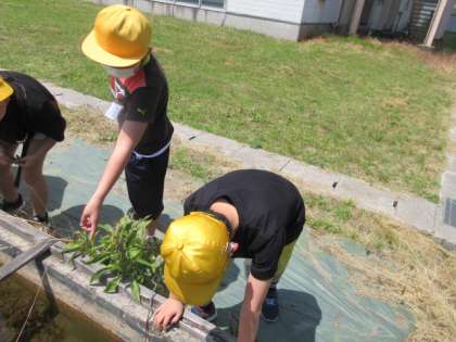 教室で発表したり、メダカを放った池を見に来たり・・・