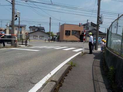 鍋田の交差点では、自分の足で横断歩道を歩き、広田交番の方から、止まる場所、わたる時に見る信号など詳しく教わりました。