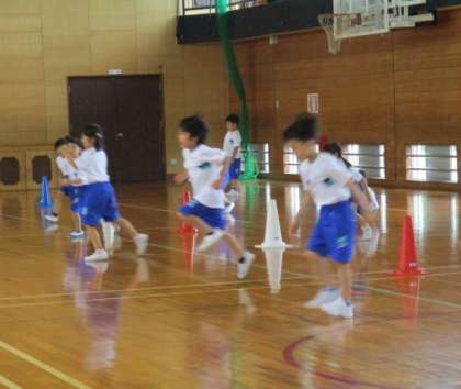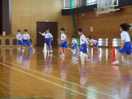 体育館での初めての学習です。ソーシャルディスタンスを意識し、体つくり運動をしています。
