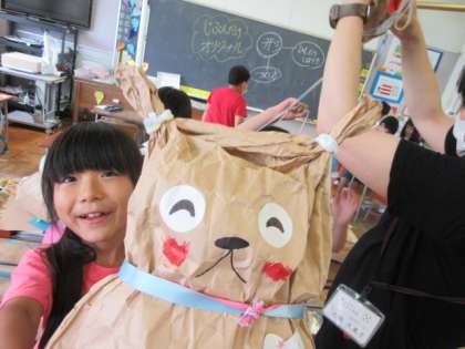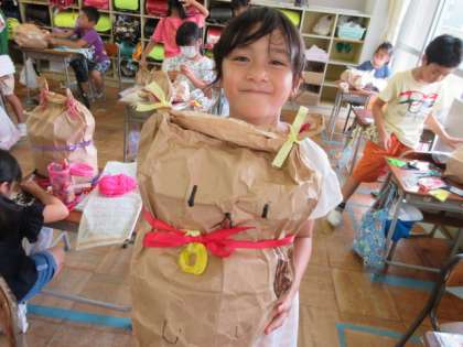 無地の紙袋の中に新聞紙を詰め、あっちこっちをしばってみると、何かに見えてきました。