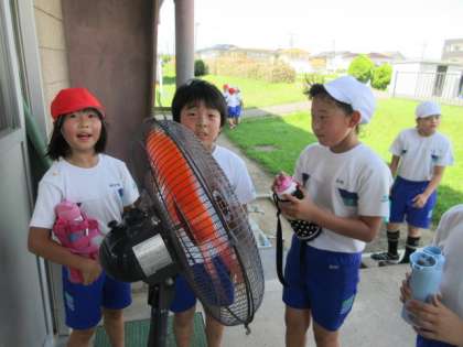 体育では、小刻みに日陰で休憩をとり、水分補給を行っています。
