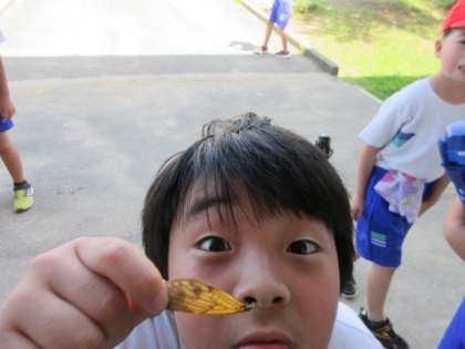 この休憩の合間にも、セミの羽を見つけて見せてくれました。