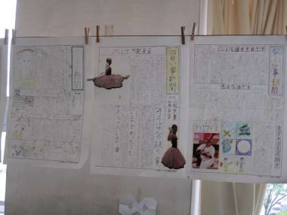 出来上がった新聞は教室に掲示してあり、友達の新聞を見入ったり、友達の新聞の工夫をを見付けて自分の新聞に取り入れたりしていました。