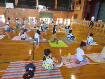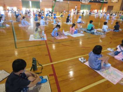 集合するときに密にならないように、各家庭で用意していただいたレジャーシートを敷いて、担任の話を聞いています。