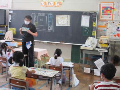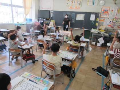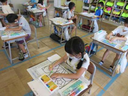 1年生のこの教室では、今日、初めて水彩を使う学習をしていました。