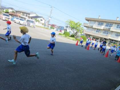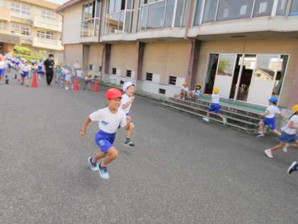 2年生は、この涼しい日かげで、軽く走ってみて体をほぐしています。