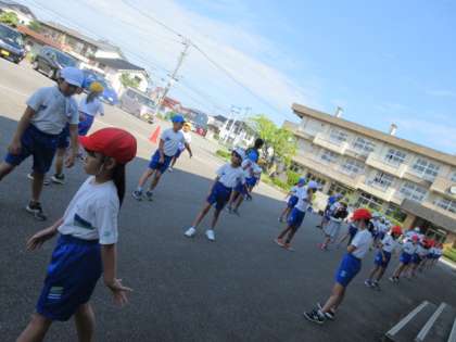 気温が上がる前に、全員リレーの練習をしています。