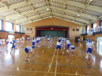 まず6年生がしているのを5年生がギャラリー(体育館上)から見ていました。