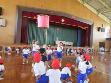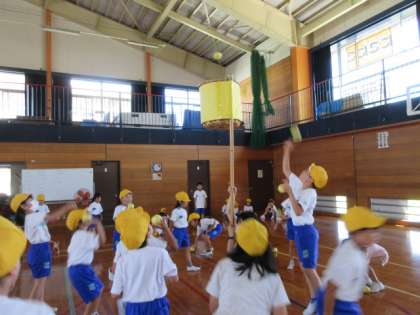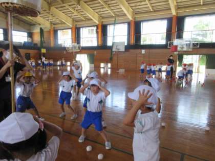 1・2年生が体育館で玉入れの練習をしています。