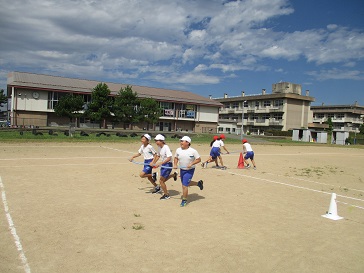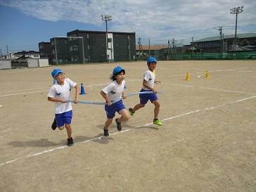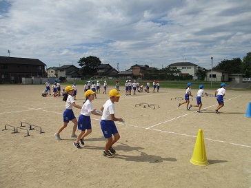 今日はグラウンドで練習しました。「速く走るだけではだめだから、丁寧に回ったり跳んだりすることを頭に入れて走ってね。」や「コーンを回る時のこつはできた?」や「誰と組むか、もう一度話し合ってみない?」など、色団ごとに立てた作戦を試してみたり、新たな課題を見つけたりしました。