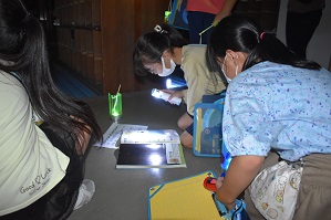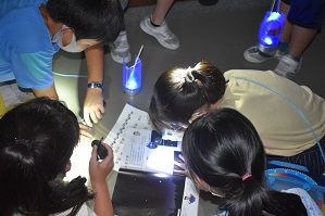 校内ポイント探しでは、問題にライトを照らしたり、みんなで星座早見表を見ながら答えを考えたりしました。
