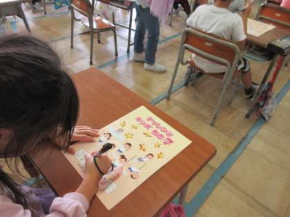 シートを見て、チャレンジする技(なわとび、てつぼう等7つの部門)を自分で決め、練習をして達成できたら、バッチをもらって、部門ごとにシールを貼っていきます。