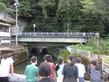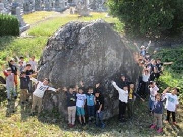 横江頭首工に続いて訪れたのは、大川寺にある常西合口用水と大場の大転石です。常西合口用水のトンネル出口を見学した子供たちは「デ・レーケさんやいろいろな人たちの苦労がよく分かるね。」「この用水の水が広田用水まで続いているなんて、びっくり。どのように広田までつながっているのか、もっと調べたいな。」などと話していました。