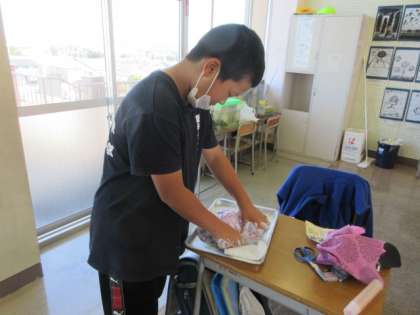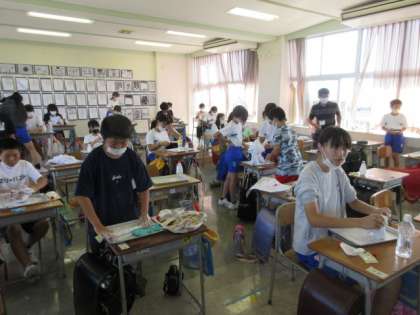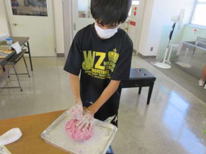 石膏に思い思いの素材を浸して、思い思いの形にしています。
