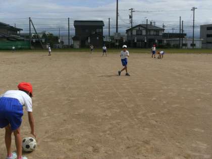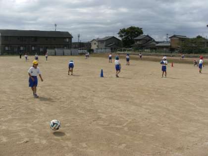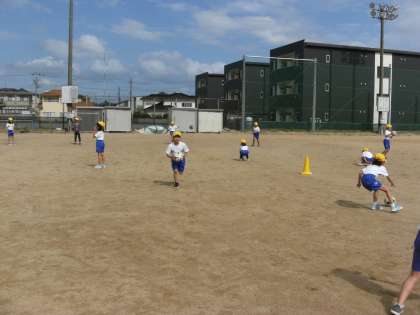 これから、キックベースを行います。強く狙ったところに蹴られるように練習していきます。