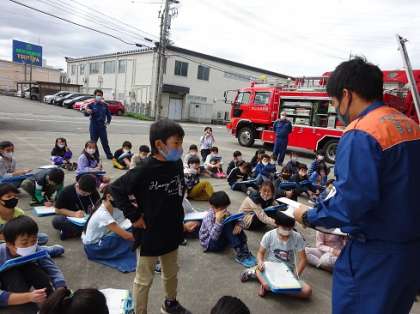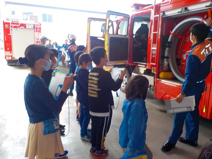 10月15日(木)に、社会見学に行きました。富山消防署では、たくさんの車両や訓練の様子を見せていただきました。子供たちは、近くで見る消防車に興味津々でした。3年生にとっては初めての社会見学でしたが、消防士の方にすすんで質問したり、一生懸命メモをとったりすることができました。