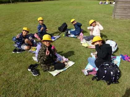 北代緑地では、芝生にレジャーシートを広げ、お弁当を食べました。食後はアスレチックで楽しく遊びました。とても充実した1日になりました。