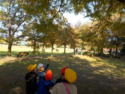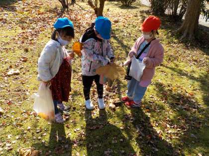 子供たちは、「とってもきれいな落ち葉を拾ったよ。」「このどんぐりは帽子が付いてるね。」「あそこの草むらにバッタがいたよ」と、秋の物や生き物を自分たちで見付けながら、活動を楽しんでいました。