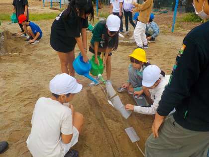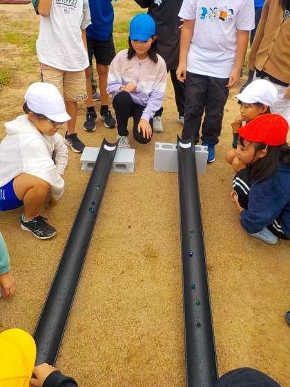 グラウンドの砂場の砂を利用して作った小山から、流す水の量を変えたり、カーブの道筋に水を流したりして、様子を観察しました。また、傾きの違うレールにビー玉を転がし、速度を比べるなど、流れる水のはたらきについて理解を深めることができました。