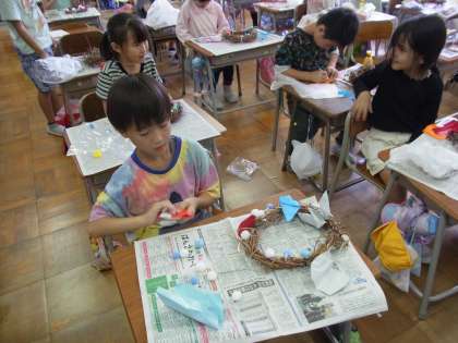 あさがおのつるで作ったリースに、各自用意をした材料を付け、素敵な作品にしました。ハロウィンやクリスマスに向けて飾り付けをしたり、自分らしさを飾り付けで表現したりするなど、子供たちは夢中になって作品を作っていました。