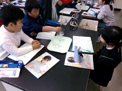 理科「物の体積と温度」では、空気はあたためられたり冷やされたりすると、体積が変わるのかどうか実験しました。ガラス管の中の水が動く様子を真剣に観察し、「水をあたためると上がって、冷やすと下がっていく」「エレベーターみたい!」と感動していました。