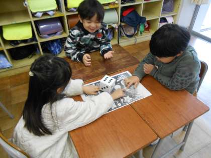 今日から箱を使ったすごろくづくりをしていきます。つくる前に、実際に班の人とすごろくをしました。「すごろく楽しかった、どんなすごろくをつくろうかな」「みんなで遊べるすごろくを次の時間につくってみる」など、すごろくを楽しみながら、どんなすごろくをつくろうか考えている姿が見られました。