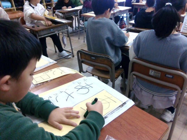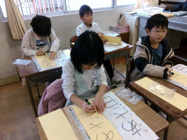始業式後に、書き初め大会があり、2年生は「あさ日」を書きました。冬休み中にたくさん練習してきて、一字をゆっくり、丁寧に書く様子が見られました。