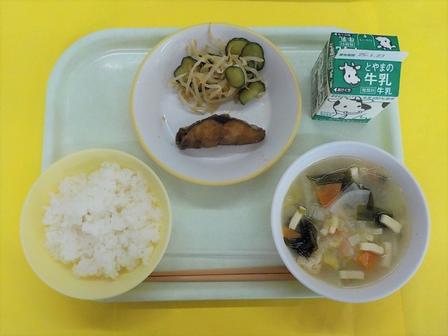 今日の給食は、ごはん、牛乳、あじのかば焼き、もやしのおひたし、高野豆腐のみそ汁でした。