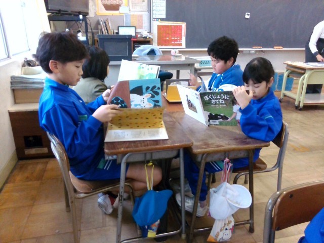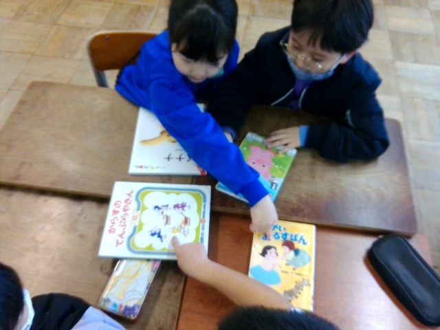今日の学び合いタイムは、「味見読書」に取り組みました。1分間に1冊の本をじっくり読んで班で本を回しました。「1分間はあっという間だね」「この本の絵がおもしろいな」と互いに感想を伝えていました。