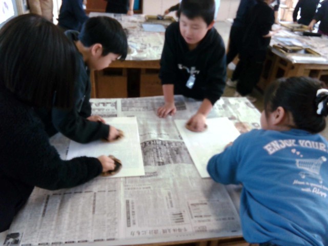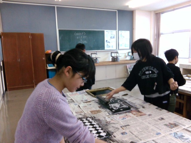図画工作科では、版画を作成しています。今日は彫り終わった版を刷りました。子供たちは、頑張って彫った絵が紙にきれいにうつり、とても嬉しそうにしていました。