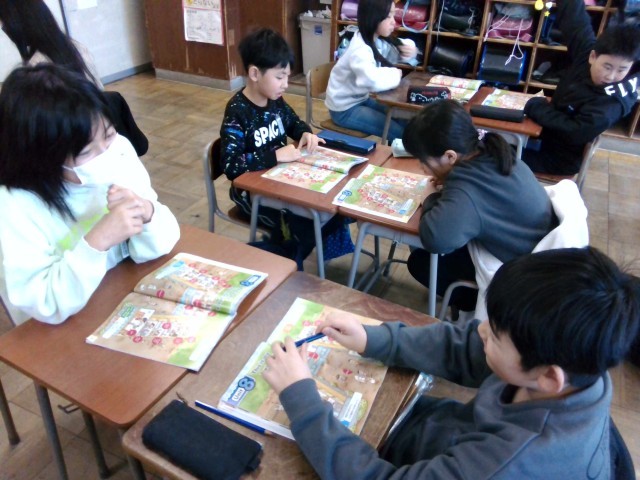 外国語活動では、ペアで教室内を案内し合いました。前回よりも「Turn left」「Go straight」等の道案内の表現や、教室名の言い方に慣れ、積極的に話す姿が見られました。