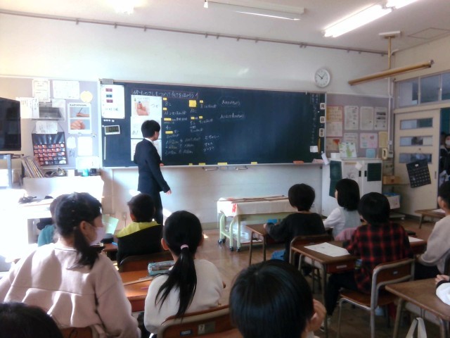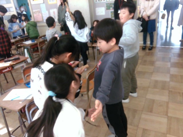 算数科の「長いもののながさのたんい」の学習を行いました。親指と人差し指を直角に広げた時の長さ「あた」で、自分の手を広げた時の長さをグループの友達同士で協力して測りました。「1mものさしを使うと、早く測れるね」と気付く子供もおり、長いものの長さを簡単に測れることを学びました。
