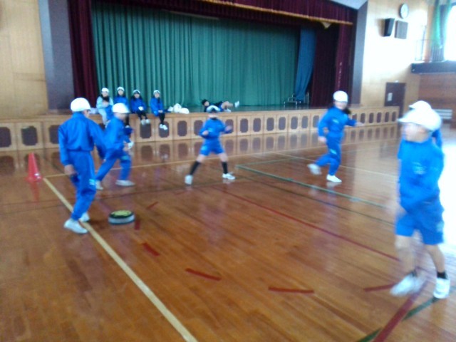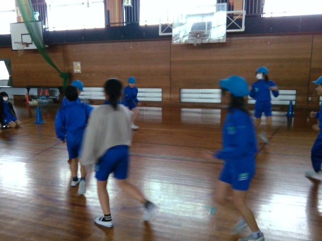 体育科では、「ディスクサッカー」の試合前に、円になって走りながらパスをする練習をしています。足のどの部分で蹴ればよいか、もう片方の足はどの方向を向いていればよいかなど、教えてもらったことを生かしてパスを回そうとしていました。