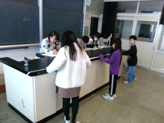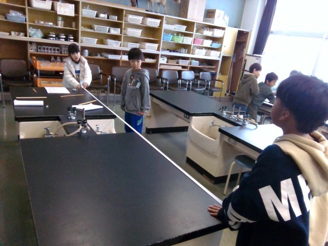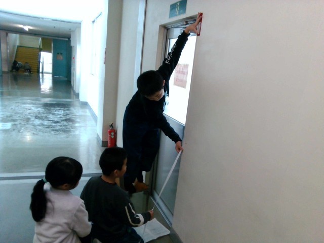 渡り廊下の掲示板、理科室の机、非常口の扉など、30cmものさしや1mものさしでははかりにくいものの長さを、まずは予想して、そのあと実際にはかってみました。