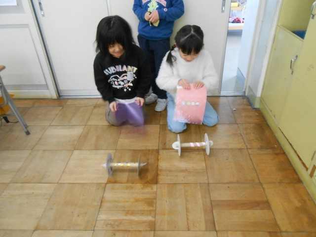 かみざらコロコロをしました。自分なりにタイヤに絵を描き、飾り付けをしました。完成後は転がしてみんなで活動を楽しみました。