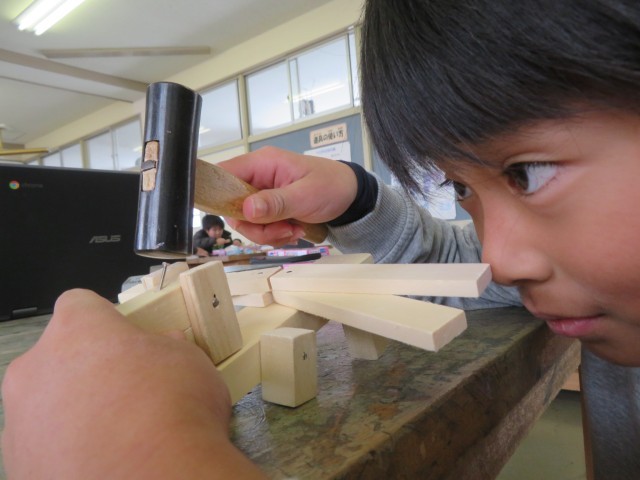 図画工作科では「くぎうちトントン」の学習を行っています。「まっすぐにくぎをうつことが難しい」、「徐々にコツをつかんできた」と失敗をしながらも、くぎをうつ手ごたえを楽しみながら活動しています。