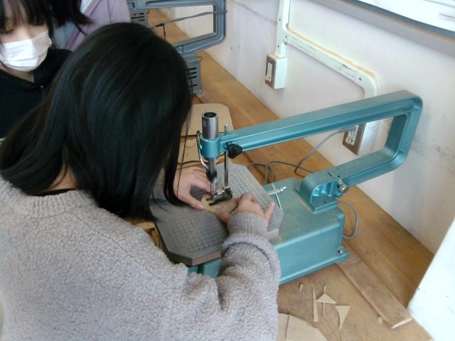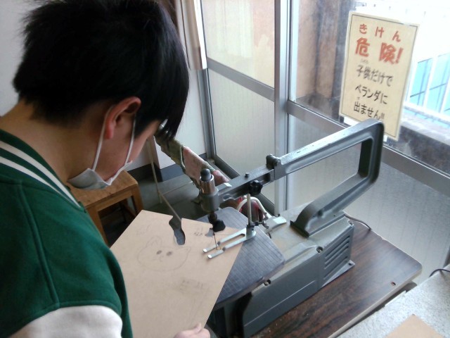 図画工作科「糸のこ スイスイ」の学習では、下絵の線に沿って糸鋸で丁寧に切り進めています。