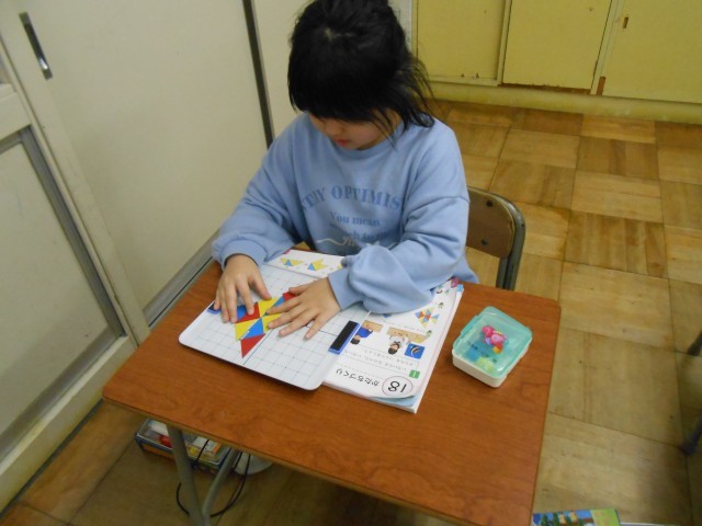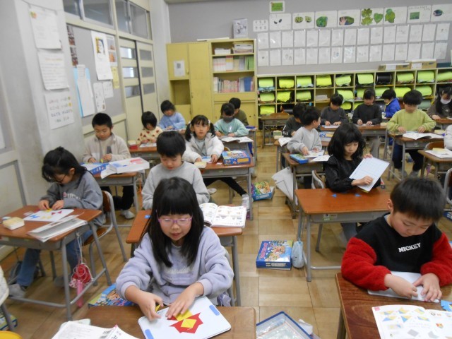 色板を使って、船やロケット、手裏剣、風車等の形をつくりました。できた形を友達に紹介したり、気付いたことを発表したりしました。