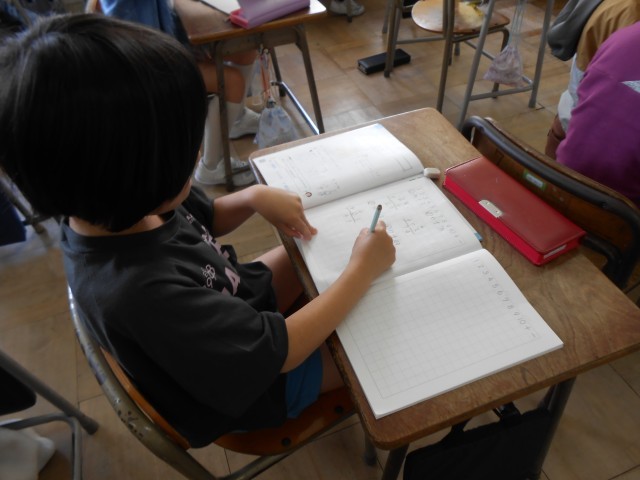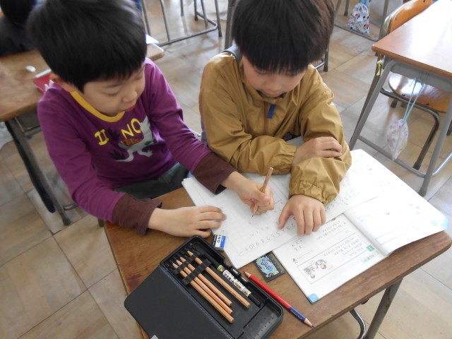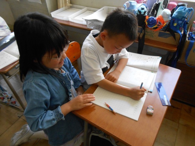 足し算の筆算の仕方を勉強しています。自分で解いた後、困っている友達に解き方を説明するミニ先生タイムも行っています。協力し合いながら学習に取り組んでいました。
